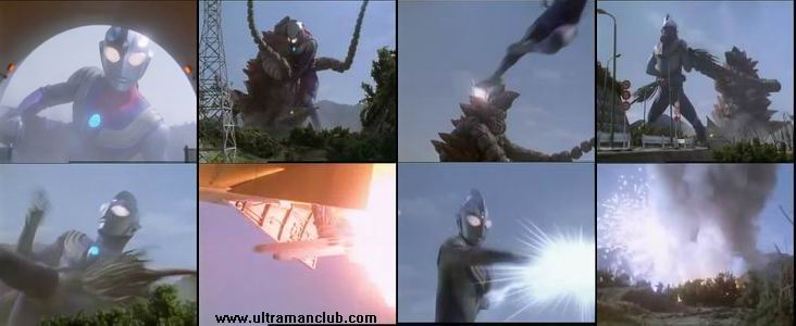大古变身为迪迦奥特曼,把怪兽从隧道口拉开。但面对怪兽的酸雾和两个强有力的鞭子,毫无对策。他变为空中型,但依然陷入苦战。