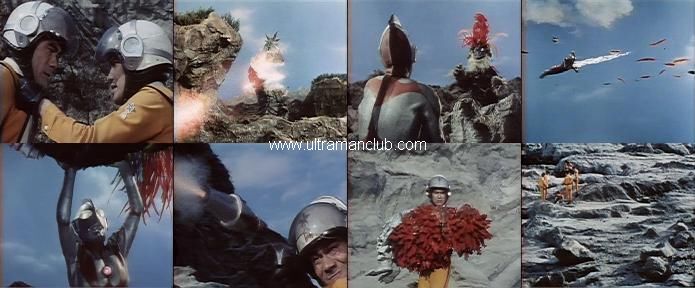 就在这时,一阵低沉的吼声从山凹中传出!这次事件的总后台、怪兽酋长杰罗门终于露出了原形。村松队长三人不失时机地开枪射击,但却被杰罗门吹起的巨风掀到了半空中!