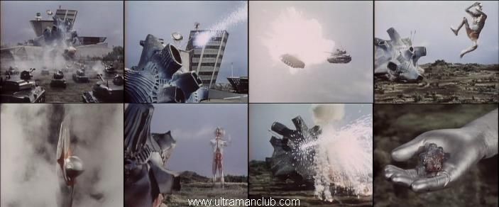眼看着自卫队的解围行动失败,早田不能再干等在这里了,他迅速地拿出传感器变身为奥特曼,向着怪兽一脚飞踢过去,可这一次,情况却不一样了。在怪兽怪光线的威力下,奥特曼被突然定在了半空,接着身不由己的高速旋转起来,越来越快,然后像刚才的那些坦克那样陷入了地下。但奥特曼毕竟是奥特曼,他开始高速旋转起他的身体,形成了一种看不见的冲击波,摧毁了怪兽的武器。接着一发斯佩修姆光线下去,怪兽开始支撑不住了,它那庞大的身体开始飞向空中,打算一逃了之。不过奥特曼丝毫没有留下这种机会,一发光线紧接着又打了出去,怪兽随即在空中炸开花,回到了原本的陨石状态。奥特曼走了过去,用他那有力的手掌,将已成为小陨石的怪兽一把捏碎。