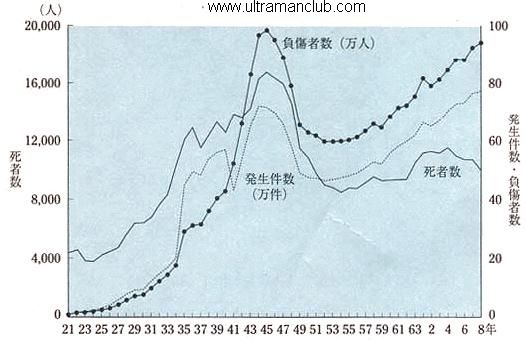 (1)进入60年代,日本经济步入了高速增长时期,尤其是在拍摄奥特系列前三部曲的这1966年到1970年四年间,是日本战后持续时间最长、经济增长率最高的阶段。在当时,日本家庭所梦想的三大件是:彩色电视机、空调、轿车,简称“三C”(因为它们的英文打头全是C),又称“新三种神器”(区别于60年代初期的黑白电视机、电冰箱、吸尘器),全日本的汽车数量包括私人汽车的拥有量急剧膨胀。然而另一方面,这又带来了一场悲剧。整个交通体制并没有适应着经济发展的步伐进行改进,在如此大量的汽车冲击下迅速变得落伍了(大家仔细些的话可以发现,片中的国道缺乏安全设施,而且路面上也没有行驶标线)。于是,交通事故数量每年都在节节攀升,而死亡人数自1959年步入万人大关后便一直没有回落。就在初代奥特曼播出的1966年,因交通事故而死亡的人数达到了13409人,创下了日本战后最恶劣的记录,其中15岁以下的未成年人占到了受害人数的15.3%。此后,这一记录不断被刷新,在1975年达到了最高点(16765人)。此外,繁忙的城市交通也带来了严重危害人体健康的废气污染。因为如此严峻的情况,日本有关部门从60年代中期开始展开了浩浩荡荡的“交通战争”,这包括在全国、尤其是中、小学和幼儿园中普及交通安全知识,对落后的交通体制进行彻底地改造,制定了一系列严格的交通法规,大规模兴建立交通安全设施(比如安全岛,人行天桥)和城市绿化。总算,这一系列举措收到了成效,自70年代末期开始,交通事故发生率在逐年回落,1981年以后死亡人数又降至万人以下。如此结果,也算是对像本片中Mutoh Akira那样的无辜者的一种迟到的慰籍吧。