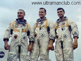 阿波罗1号烧毁的坐舱(左)和殉职的三位宇航员(右)
