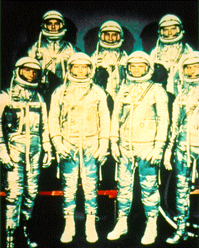 美国第一代载人航天计划——水星计划中的宇航员。特点是有着银白色光泽的宇航服。下图是当时经过严格挑选参加水星计划的7名宇航员集体照。