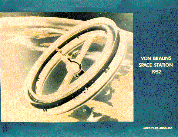 二、早期火箭研究的重要人物、二战后去美国的德国科学家冯.布劳恩在1952年设想的未来太空站的形状。这个设想后来被东宝公司1959年的特摄电影《宇宙大战争》中采用。