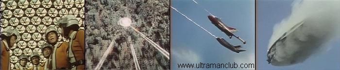 于是,全体队员们乘上装有新式武器的喷气机,向着不明飞行物可能出没的地域进发。在经过一番拉网式的搜查后,雷达终于捕捉到了目标的踪迹。随着队长一声令下,2架战机依次射出三种射线,瞬间覆盖了目标区域。“看见了!”隐形火箭在新式武器的发威下终于现出了原形,发觉形迹败露,它高速旋转着逃向空中。到手的鸭子怎么能让其飞掉!大、小“威托”立刻抢占高度,猛扑了过来。一番光线攻击过后,火箭被击中冒起了浓烟,接着摇摇摆摆地坠入了森林当中。