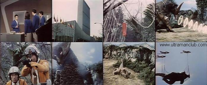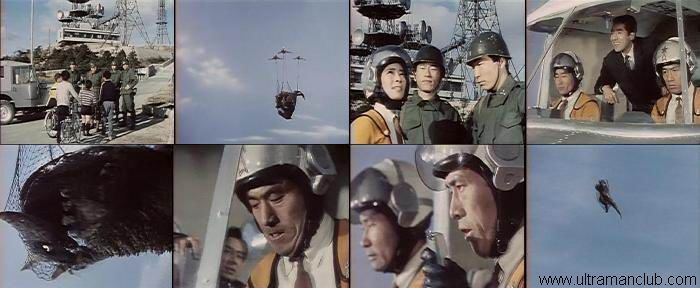 可真是天有不测风云,就在大家还正沉浸在刚才的热烈气氛中时,整个飞机开始剧烈的抖动。顺眼向下看去,所有人的心都不禁一下提到了嗓子眼上:本来应该是处在麻醉弹有效时间内的怪兽,此时却睁开了熟睡的双眼,开始在网中“舒展身体”。因为纬度的改变引起温度变化,使得麻醉弹的药效减弱。渐渐地,整个机群有些支撑不住了,如果怪兽再这样挣扎下去,那面临科特队员们的命运无疑是机毁人亡。迫不得已,村松队长下令解脱网绳,将怪兽从2000米的空中径直抛下!
