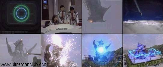 这时,在TPC总部指挥室,仍然在对逃走的怪兽哥尔赞进行搜索。可探测机从金字塔上空搜索,不管是声波探测机还是能量探测机都没有办法找到怪兽哥尔赞的踪迹。此时传来了来自总监的紧急通知:西南诸岛的九良岛出现了一头怪兽,采石场的矿工遭受了攻击,这是一个和哥尔赞不同的怪兽。目前这个怪兽还没什么动静。但总监不希望再有人遇害。同时总监还建议把GUTS的飞机改造成战斗用的机种,以便和怪兽作战。